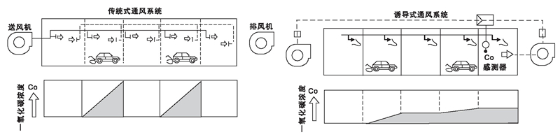 噴流誘導系統(tǒng)可設計智能系統(tǒng),在誘導空間內設置空氣質量傳感器,用以探測一氧化碳濃度,通過控制器自動控制誘導風機的開啟與停止(配置智能誘導風機),以實現自動化控制。